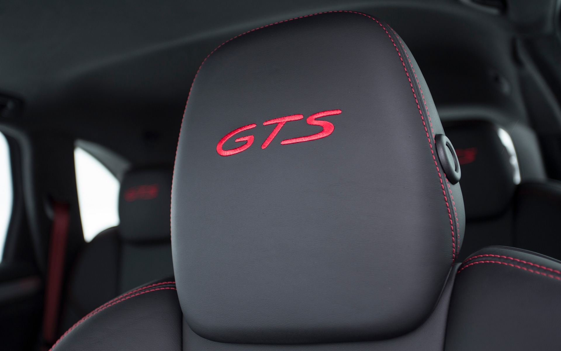Porsche Cayenne GTS 2016 - Surpiqûres en rouge et logo GTS sur les sièges.