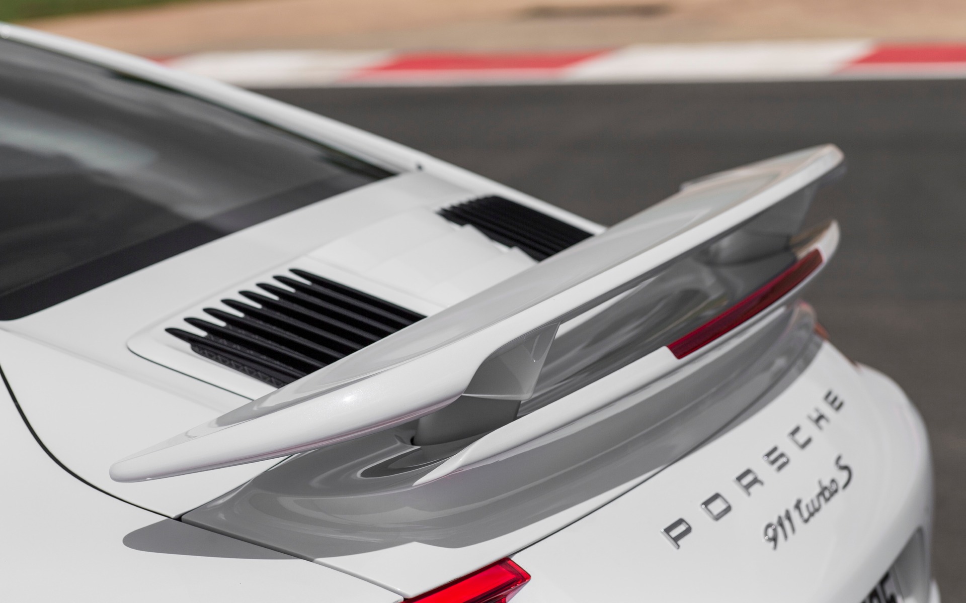 Porsche 911 Turbo 2017 - Aérodynamique active avec l'aileron arrière mobile à sa position la plus haute.