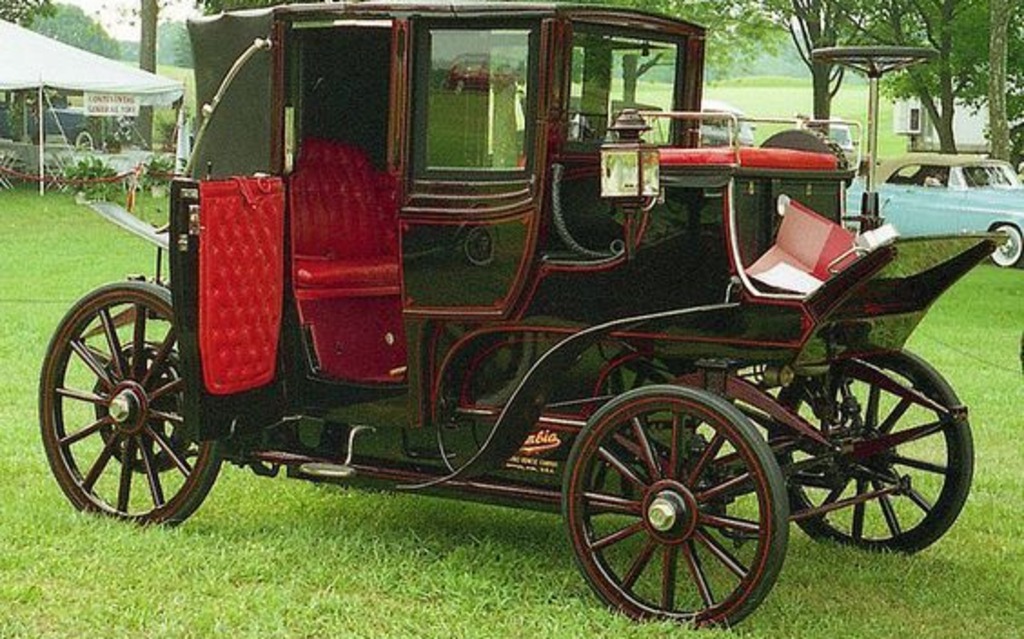 Columbia Electric Coach 1899 : moteur électrique, batterie de 44 cellules, 2 chevaux, vitesse maximale de 24 km/h
