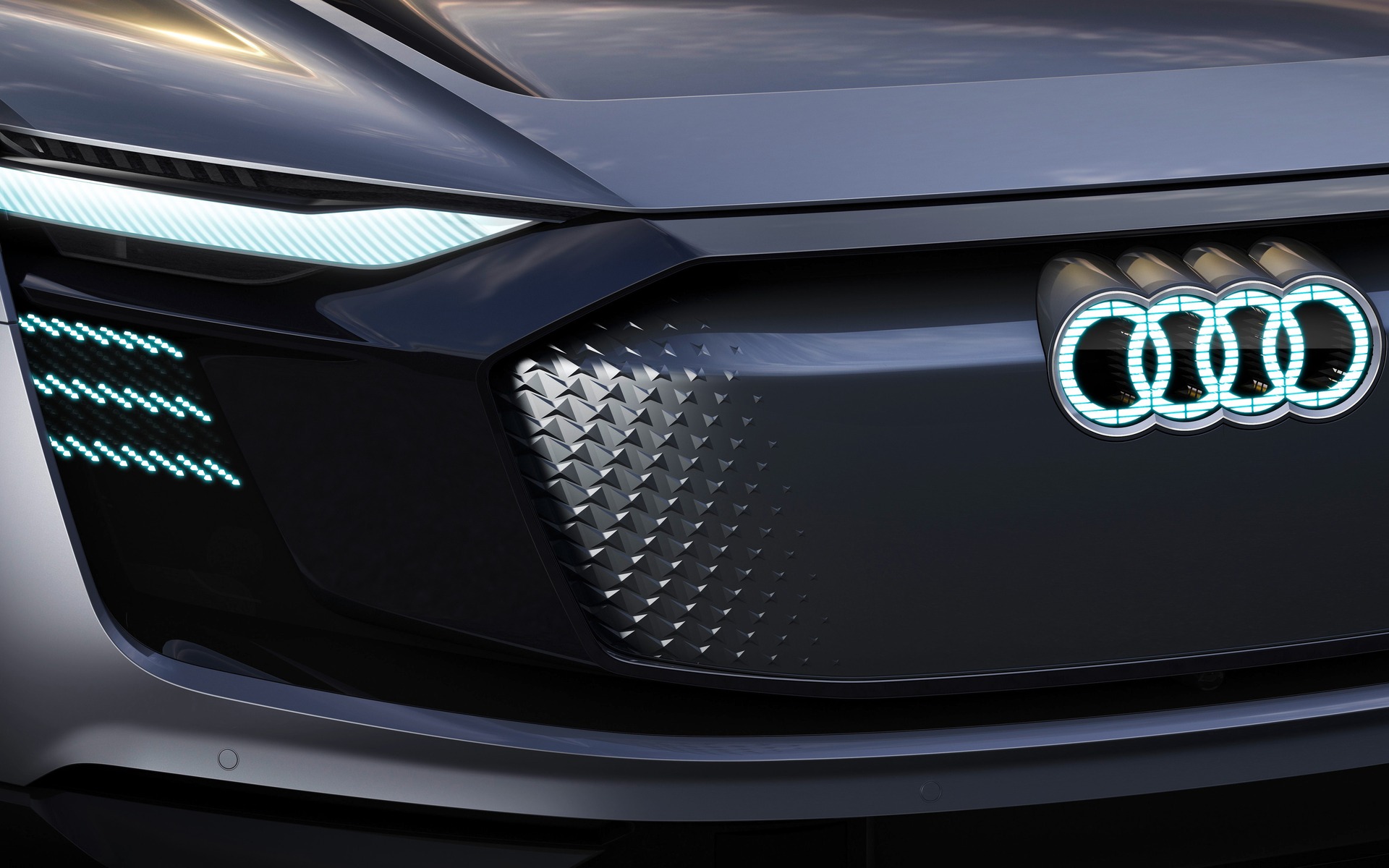 Audi e-tron Sportback Concept - Détail de la partie avant avec éclairage composé de 250 LED et logo Audi illuminé.