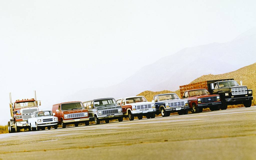 Ford Courier 1982 (à gauche) avec le reste de la gamme des camions Ford.