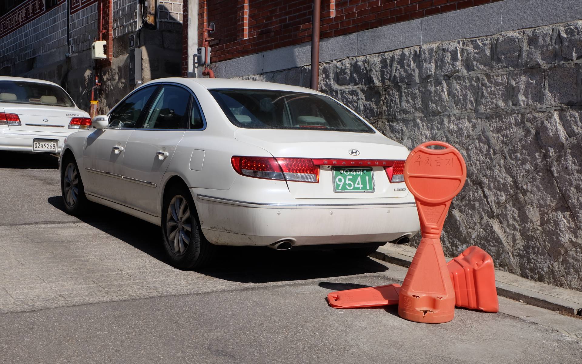 Une Hyundai Grandeur plus ancienne, mieux connue sous le nom Azera chez nous. Notez que bien qu'ils soient moins nombreux qu'à Montréal, les cônes oranges existent aussi à Séoul!
