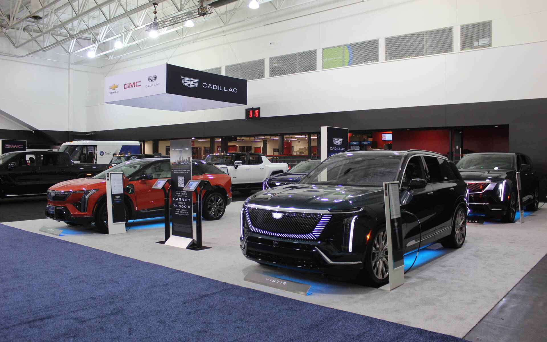 Cadillac expose ses nouveautés, dont le Vistiq et derrière lui, l'Escalade IQ. À gauche se trouve l'Optiq.