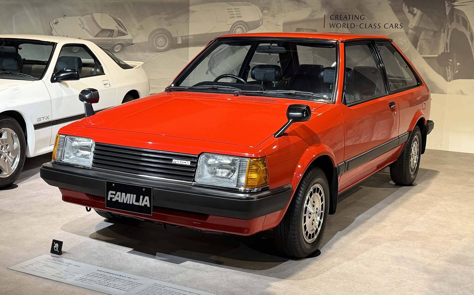 Mazda Familia 1980 — Introduite chez nous en 1981 sous le nom de Mazda GLC (Great Little Car), cette compacte aura été la première du constructeur à offrir les roues motrices avant. Elle aura été commercialisée en Amérique du Nord en modèle à 3 et 5 portes ainsi qu'en berline, avant d'être remplacée en 1986 par la Mazda 323.