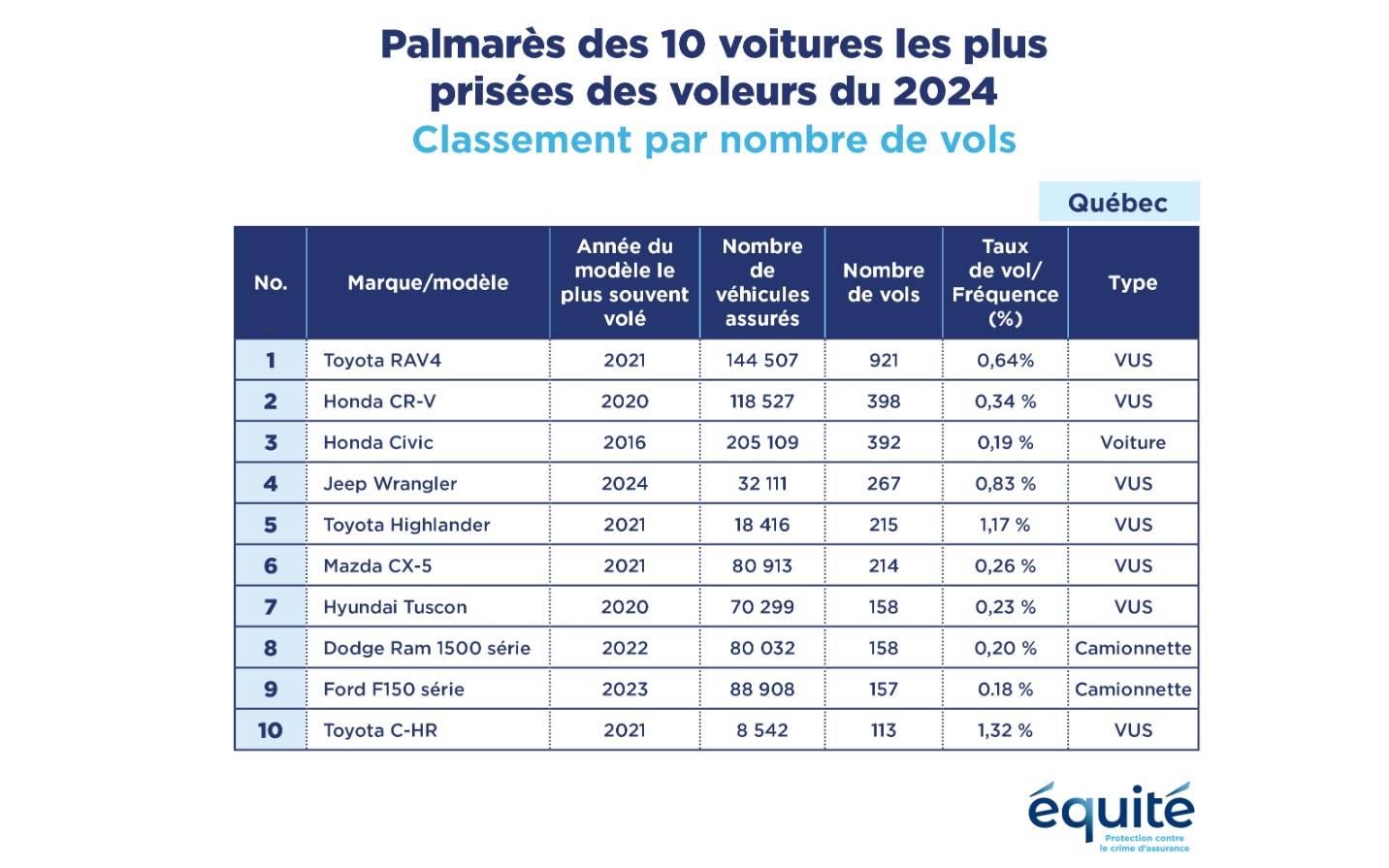Top 10 des véhicules les plus volés : le Toyota RAV4 en tête au Québec et au Canada